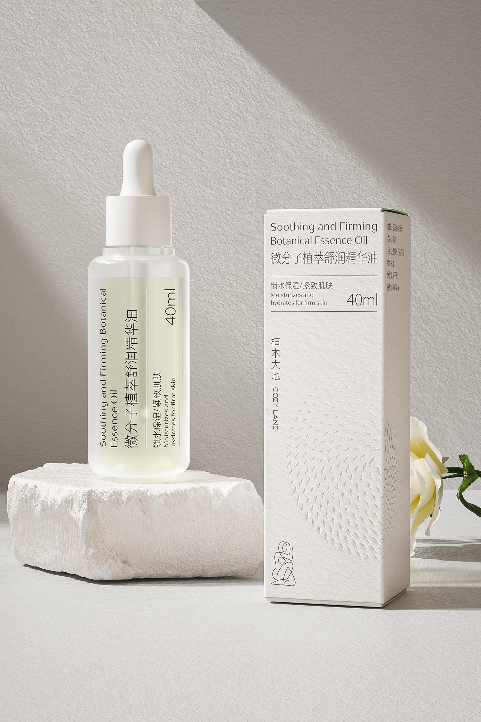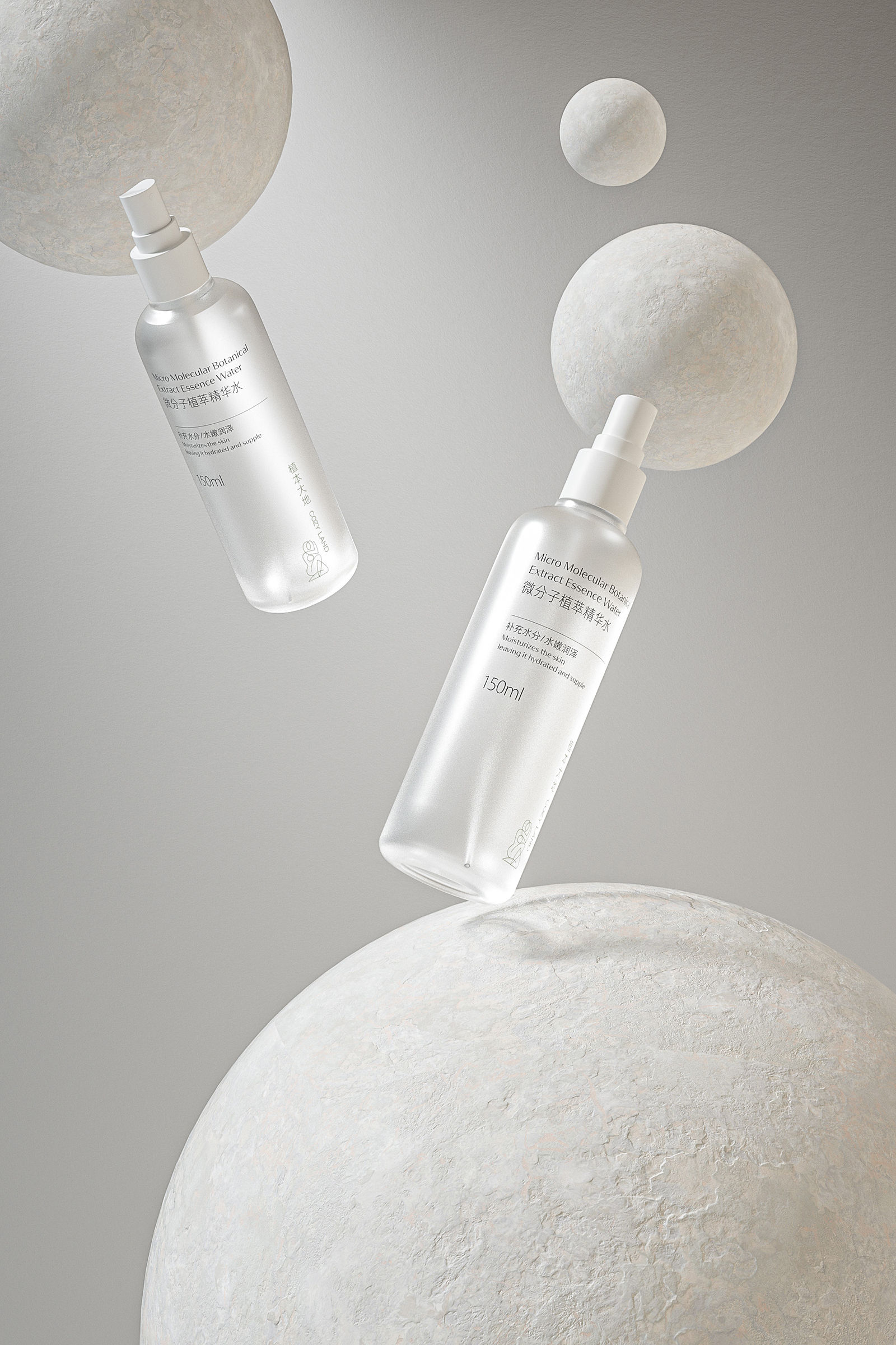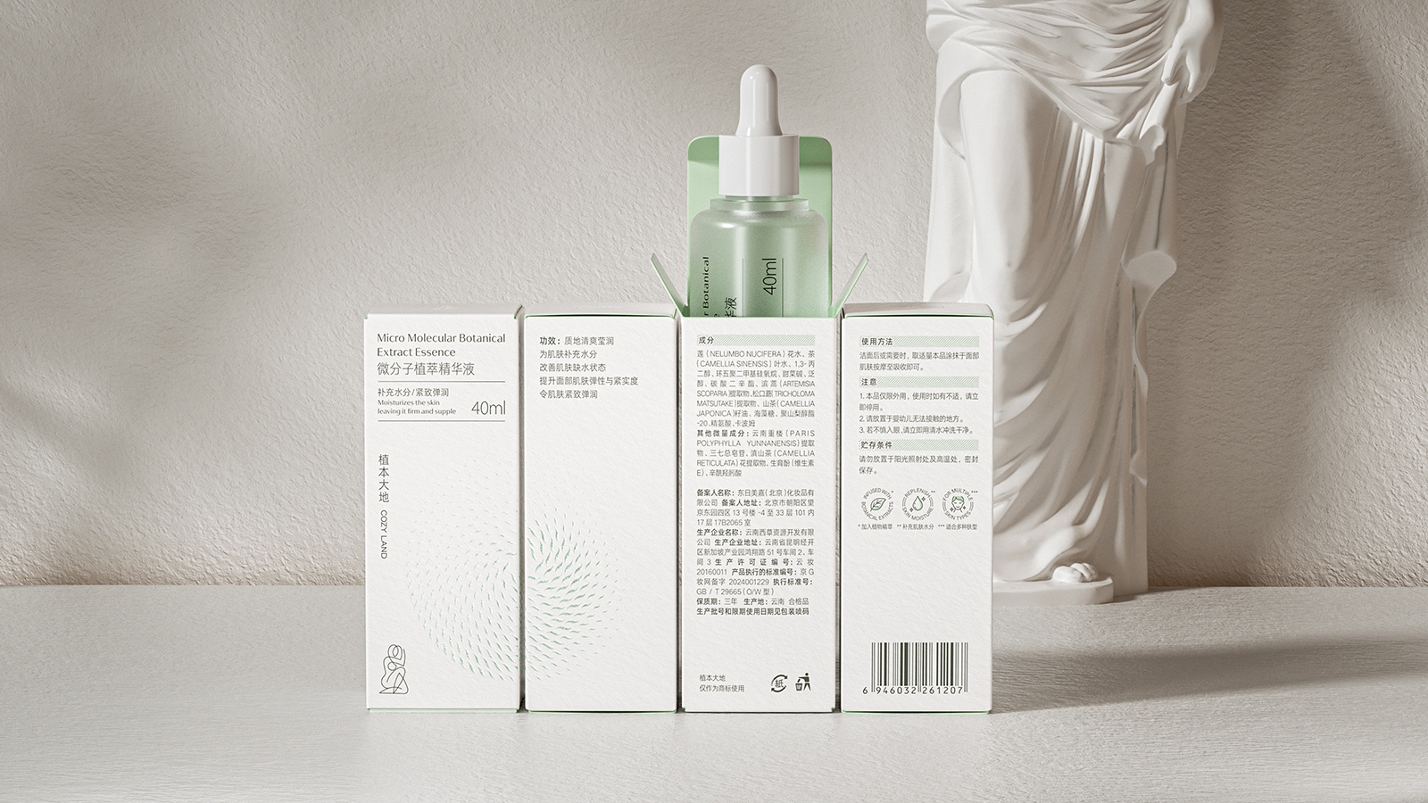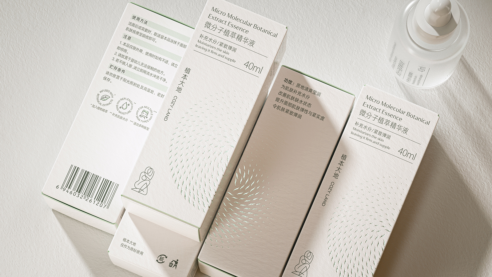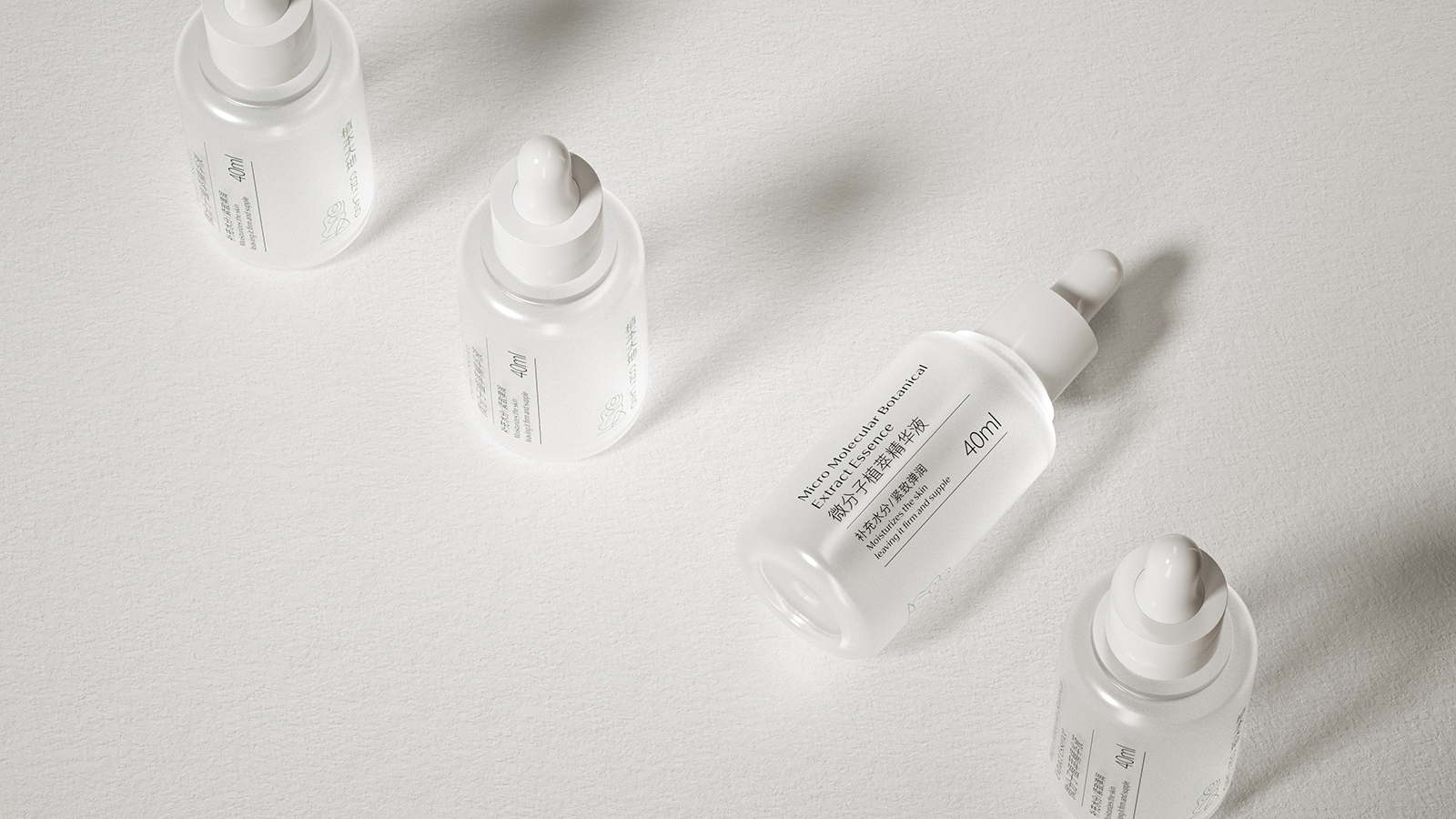 天然植物化妆品的产品包装设计不仅要求自然审美的艺术,更力求传播品牌的和谐价值和护肤特性优势。同时通过设计视觉的理念、风格与消费者进行有效的沟通。天然植物护肤系列包括微分子植萃精华水、抗皱霜、精华油和精华液。整体设计风格简约而优雅,采用了柔和的白色和米色为主色调,给人一种纯净、自然的感觉。这种颜色选择不仅传达了产品的天然成分,也符合现代消费者对简约美学的追求。