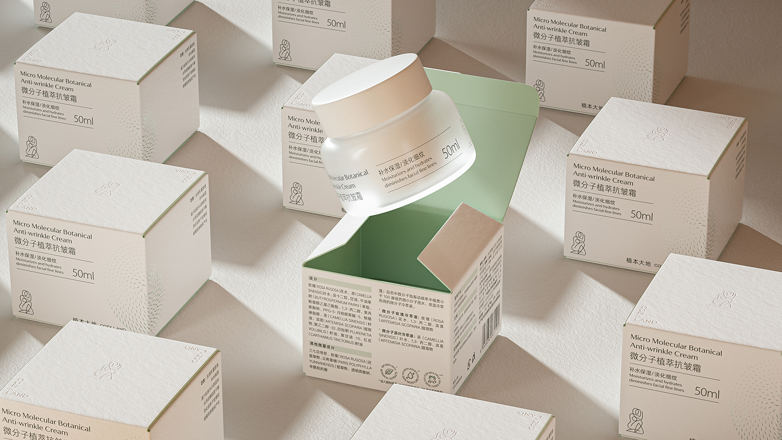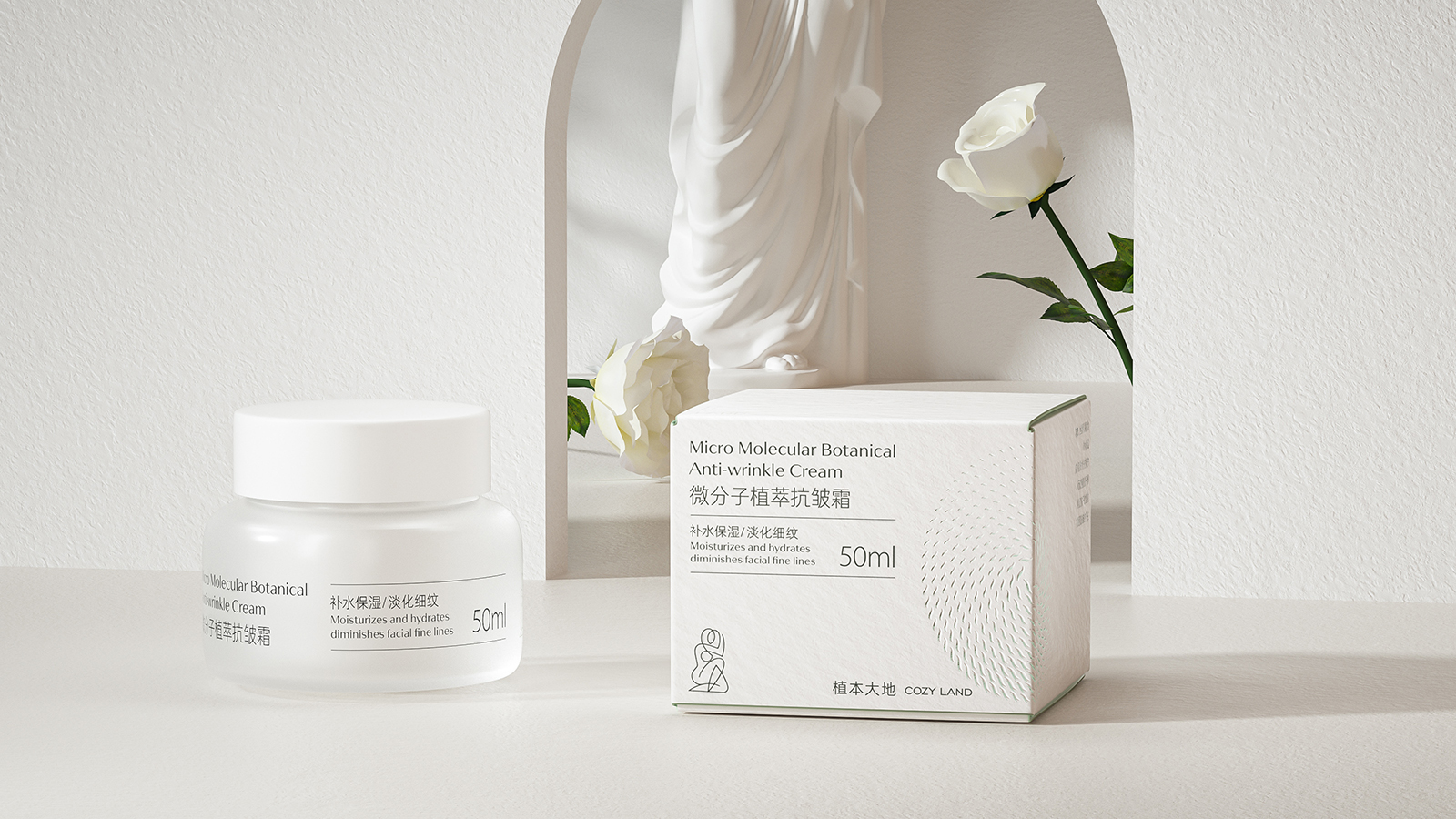 在设计细节上产品包装采用了统一的字体风格,增强了品牌的视觉识别度。包装材质采用了环保材料和表面有细腻的纹理,增加了触感的丰富性的高品质。抗皱霜的包装盒采用了白色为主色调,搭配简洁的字体和线条,给人一种专业和可靠的感觉。包装的图案设计简洁而富有艺术感,瓶身设计独特采用了磨砂质感的材质,增加了产品的高级感。背景采用了柔和的白色和米色,搭配简洁的线条和形状,营造出一种宁静和优雅的氛围。突出了产品的天然和纯净特性相呼应,同时增加了画面的美感,也暗示了产品的天然成分和护肤效果。护肤产品整体包装设计风格简约而优雅,色彩柔和而自然,细节设计精致而富有天然艺术感。通过专业的设计有效的增强了品牌的识别度和高端友好的吸引力。